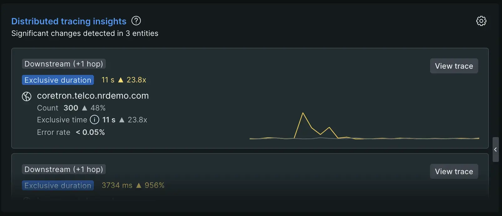 Distributed tracing data represents how the performance of entities across your distributed system impact each other. Insights from this data are surfaced with respect to individual entities you view, showing when their performance might be impacted by other traced entities.