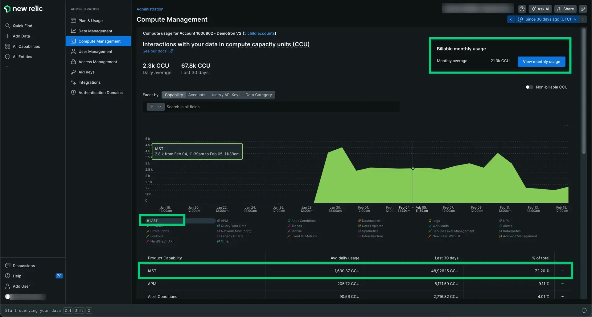 You can view costs broken out by feature and drill into IAST usage in account administration. We provide you the ability to see daily usage and 30-day rolling usage. Also, we break this down to attribute usage to specific accounts or users and APIs. You can check your IAST CCU consumption from one.newrelic.com.