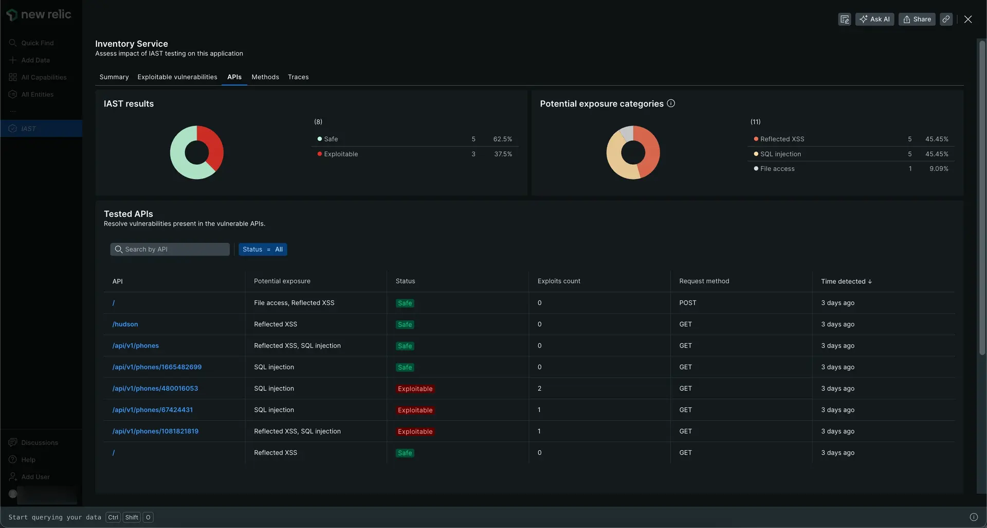Go to one.newrelic.com > All capabilities > IAST and click Tests & Applications on the left navigation pane. Select an application to see its details and select the APIs tab.