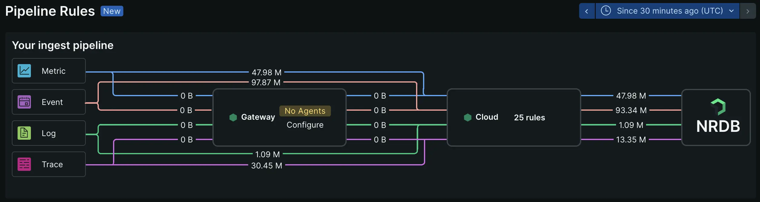 - Positioned between MELT sources and cloud rules, the gateway acts as a filter, applying your user-defined rules to drop low-value data before it exits your network. This reduces the data volume sent to the NRDB, optimizing storage and egress costs.