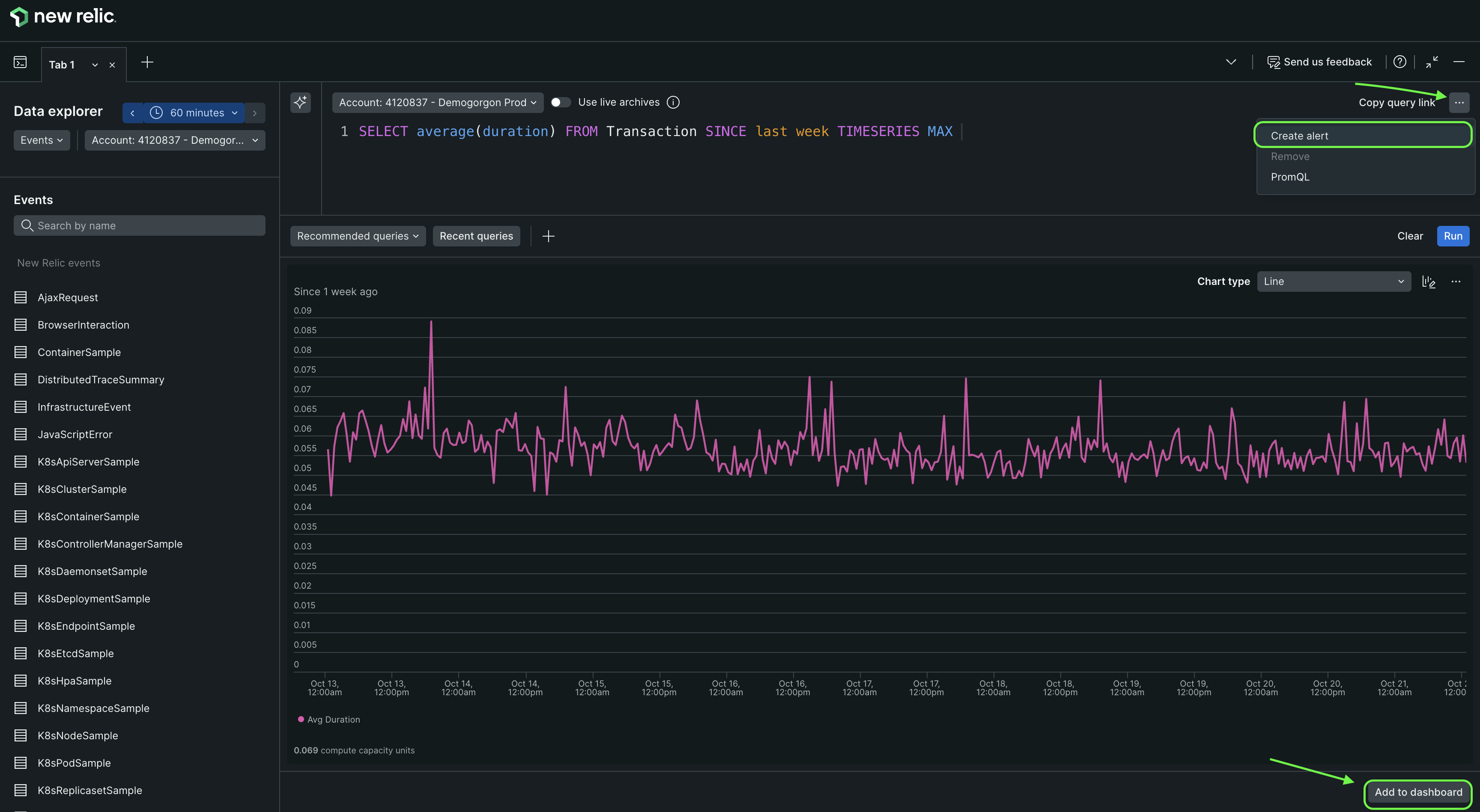 Access the query builder through the Query your data drawer at the bottom of any New Relic page to run queries and create custom charts, other visualizations, and NRQL alerts.
