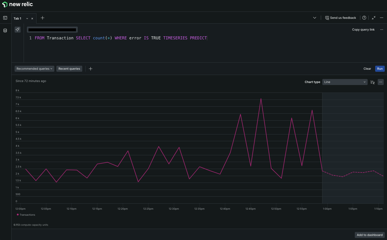 You can add NRQL predictions only to charts that depict time series data, such as line or area charts. To add a NRQL prediction to an existing chart, perform the steps as follows: