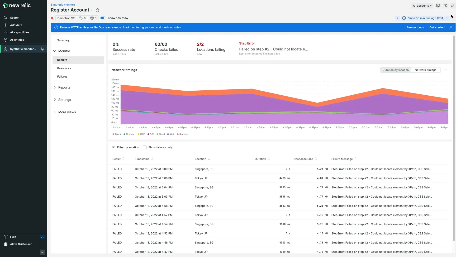 one.newrelic.com > Synthetic monitoring > (select a monitor) > Results: Use the Results page to locate interesting runs of your monitor for troubleshooting, and see where your monitors spend the most time.