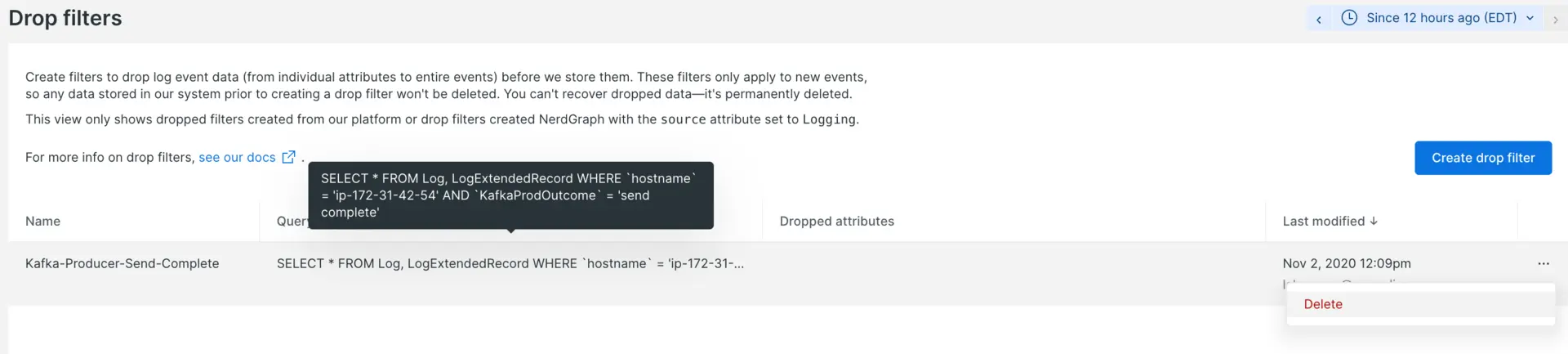To manage your drop filter rules programmatically, you can use NerdGraph, our GraphQL Explorer, to create, query, and delete your drop filter rules.