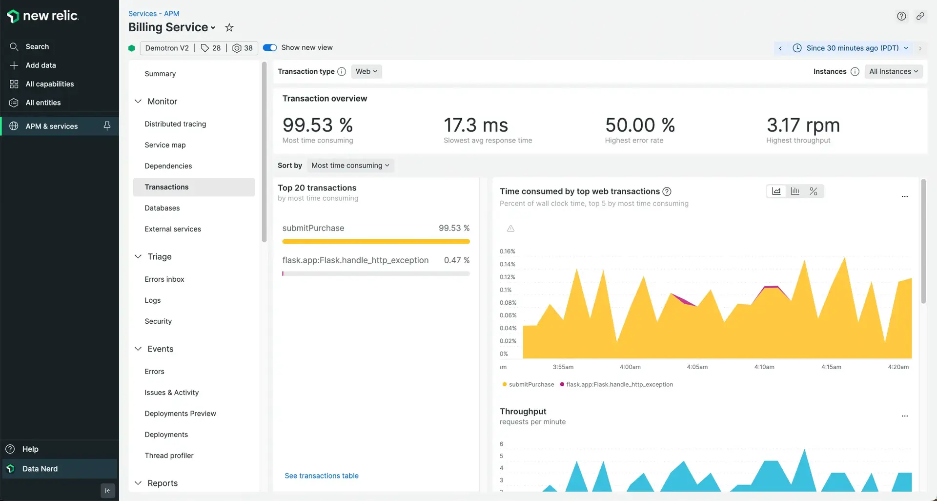The transaction name is a powerful way for you to segment your service so that you can better understand its behavior. It allows you to discretely isolate functionality directly in the New Relic UI.