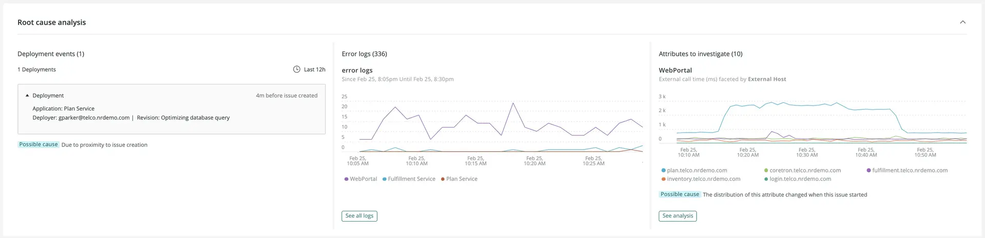 근본 원인 분석은 문제 및 영향을 받는 개체의 잠재적 원인을 자동으로 찾습니다. 미해결 문제가 발생한 이유, 기여한 배포, 관련 오류 로그 및 속성을 보여줍니다. 이를 통해 문제를 조사하고 MTTR(평균 해결 시간)을 줄일 수 있습니다.