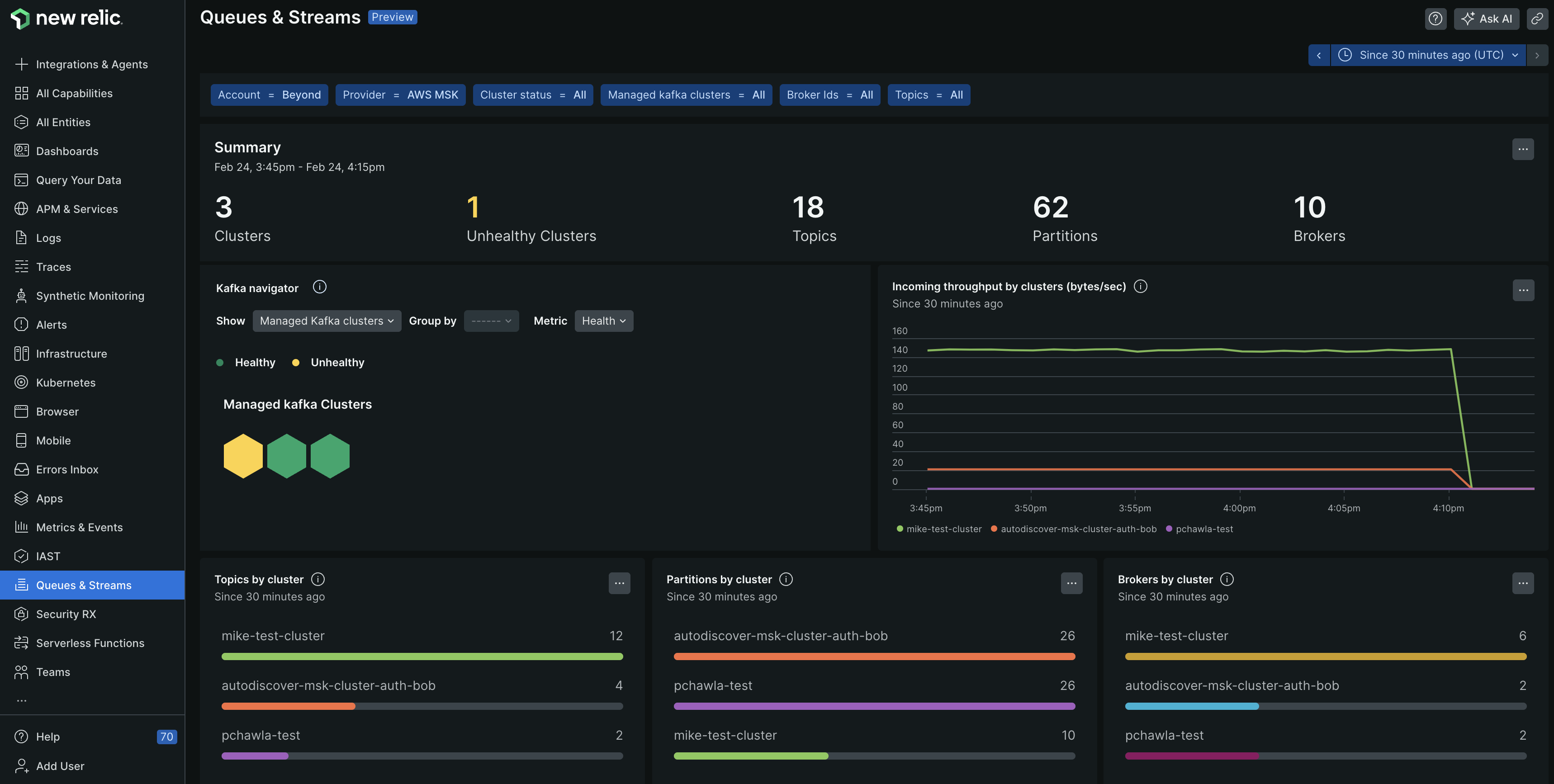 뉴렐릭 Queues and Streams는 오류, 병목 현상, 병목지점 및 조절과 같은 잠재적인 문제에 대한 자세한 인사이트를 제공하는 모니터링 클러스터 및 스트리밍 데이터를 위한 포괄적인 솔루션을 제공합니다. 이 솔루션은 클러스터, 파티션, 브로커 및 주제에 대한 포괄적인 지표를 제공하여 메시지 클러스터 및 스트림 생태계를 사전에 관리할 수 있습니다.큐 및 스트림 모니터링 시작하기뉴렐릭의 큐와 스트림을 사용하려면 먼저 뉴렐릭을 메시지 및 큐 생태계와 통합해야 합니다.현재 다음과 같은 통합이 가능합니다.아파치 Kafka(MSK)용 Amazon 관리형 스트리밍Confluent 클라우드 통합무엇 향후 계획데이터 및 UI클러스터 클러스터 및 클러스터를 모니터링하기 위해 뉴렐릭을 사용하는 방법을 알아보세요.